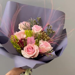 Авторский букет “Маленькая нежность”: пионовидная роза, нежная гвоздика и ароматная маттиола