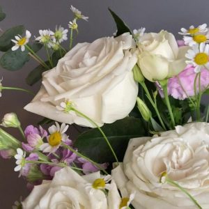 Весенняя композиция в корзине с тюльпанами и ромашками с элементами декора